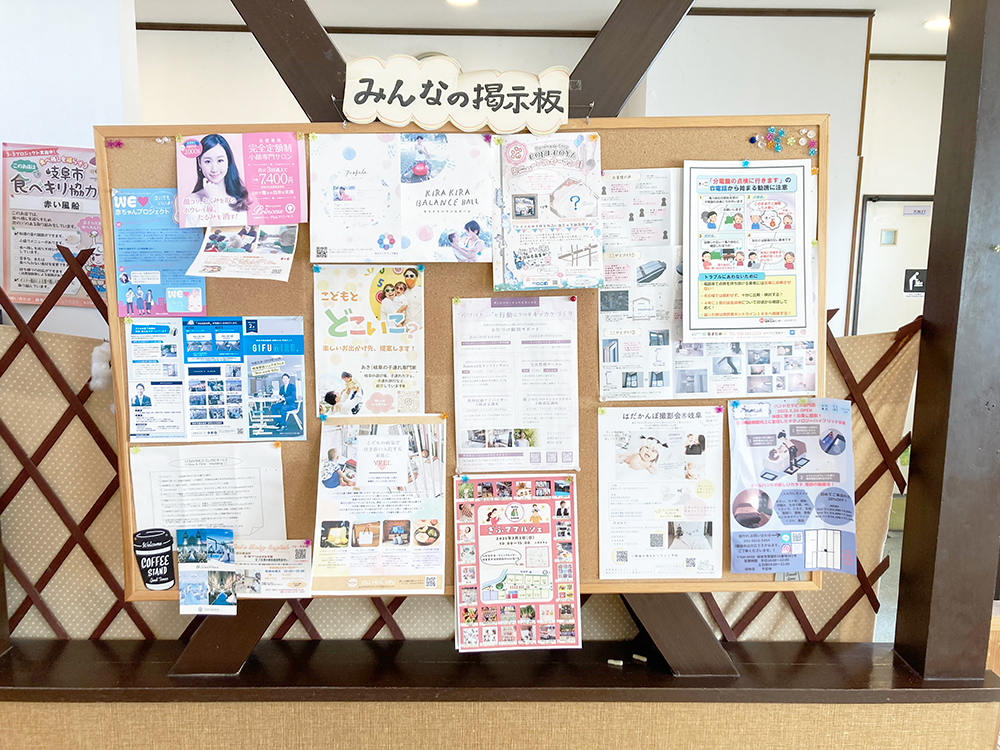 「みんなの掲示板」はいろんな情報が集まっていました。レジ付近には物販もあり、ママさん作家の作品が販売されていますよ。がんばるママさんパパさんを応援してくれてます。