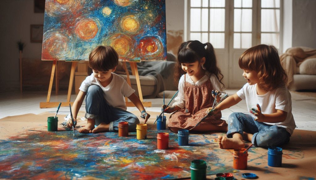 - 壁や床に白いキャンバスを用意し、カラフルな絵の具で自由に絵を描く