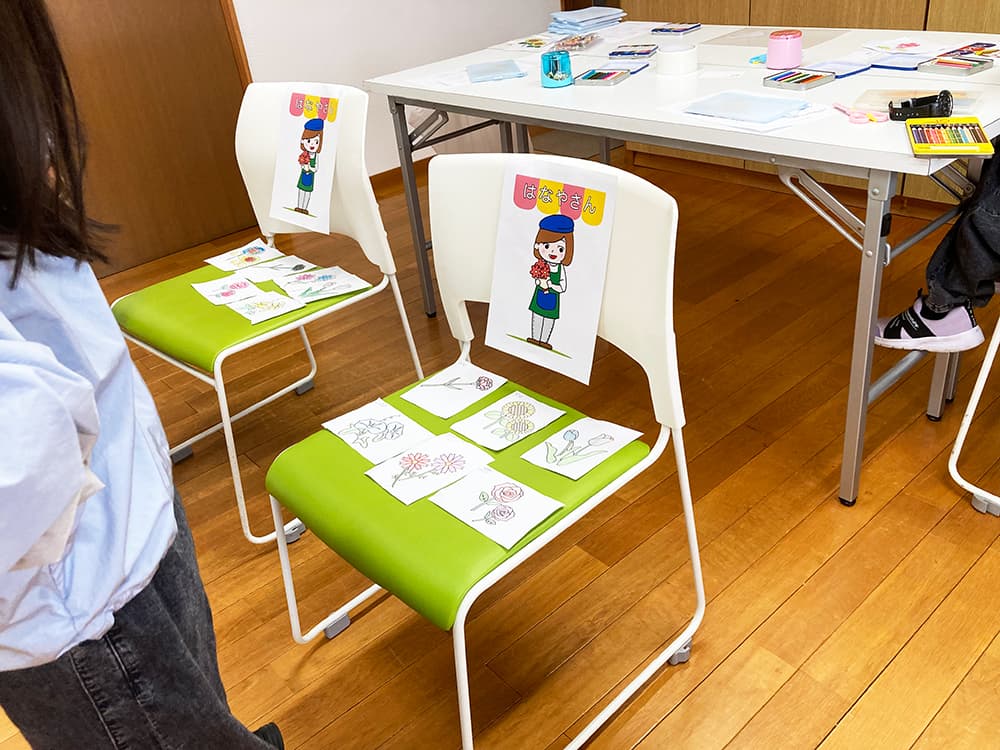 お芝居が終わったら、今度は二手に分かれておみせやさんごっこの準備です。子どもは自分でやりたいお店を選び、「どうすれば売れるかな?」などを考えながら商品の用意をします。その間大人は将来の自分と子どもの為に、お金についてもう少し詳しくお勉強です。