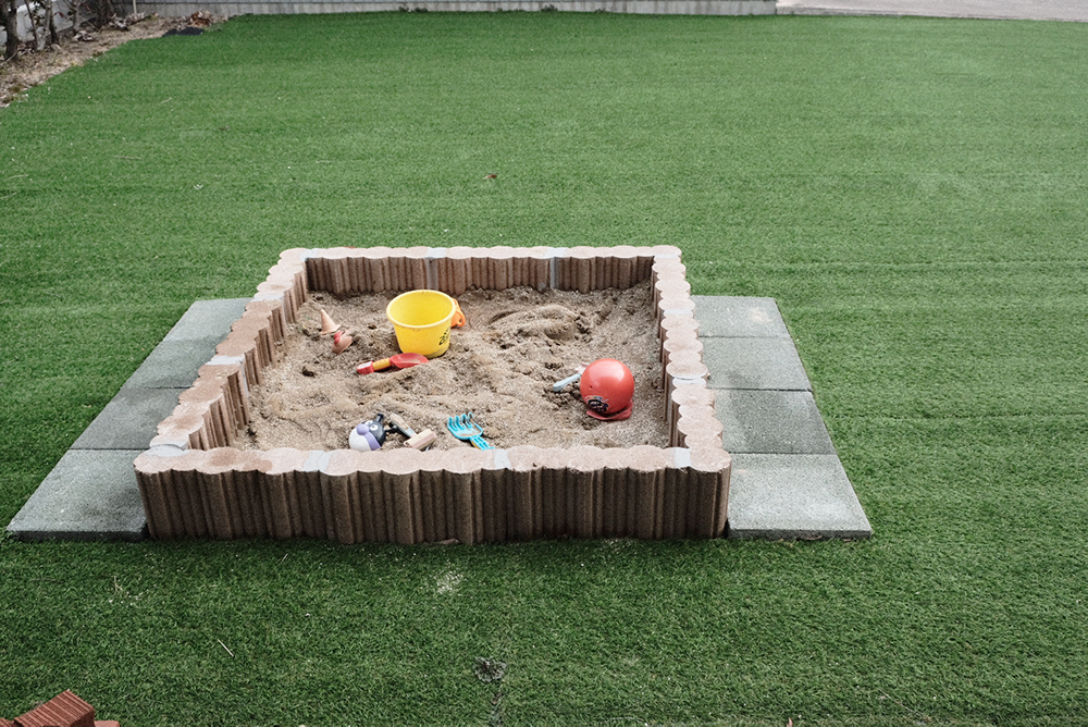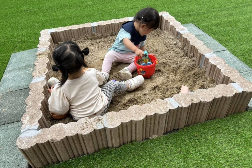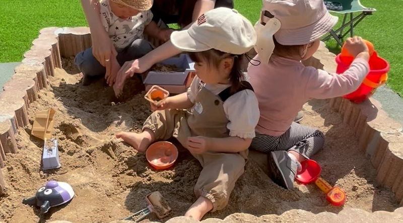 天候に合わせて、広々としたお庭でも遊ぶことができます。お庭は人工芝になっているので、ちょっとくらいのおやんちゃでも安心です。砂場で砂遊びをしたり、夏にはプールを出して水遊びが楽しめます。
