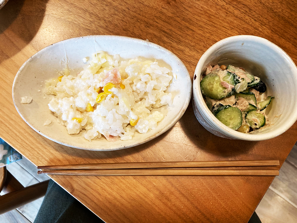 手を合わせていただきます!私にも盛り付けてくれて、ちゃっかりいただいてしまいました(笑)。自分で作った料理は特別おいしいですよね~!