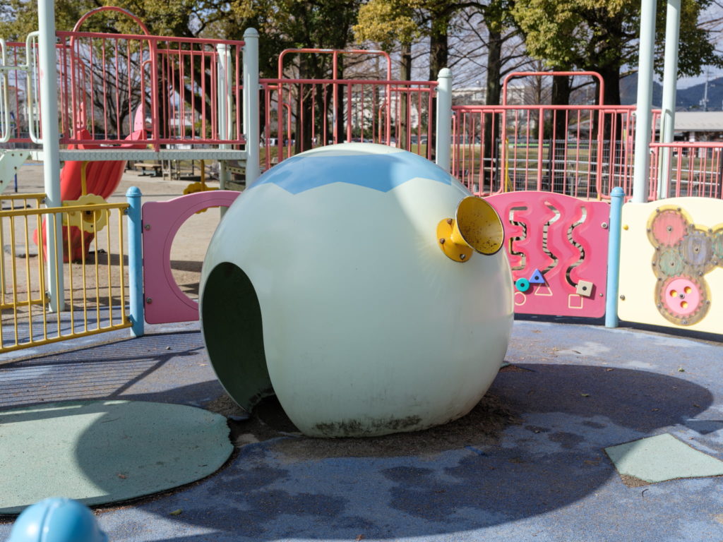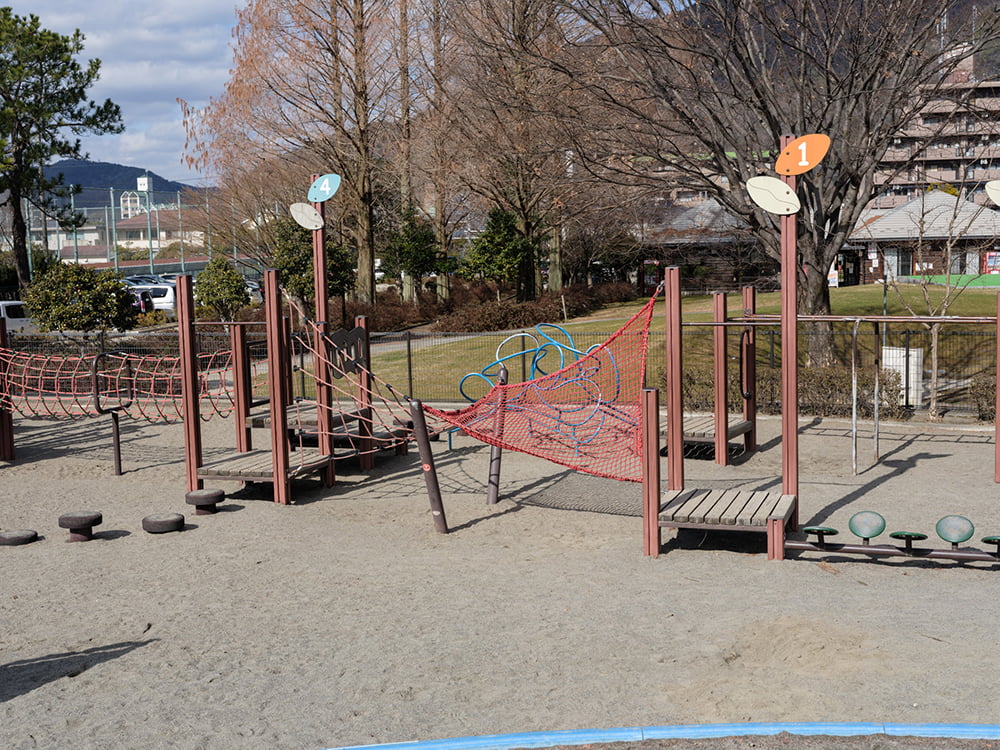 そのとなりには比較的ちいさなお子さんでもゆっくり安全に遊べる小型複合遊具もあります。複数のすべり台やネットで構成された円形の遊具になっています。中央には声を使って音で遊べる遊具もありおもしろいですよ。
