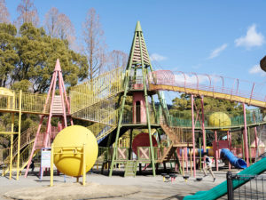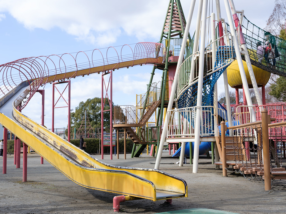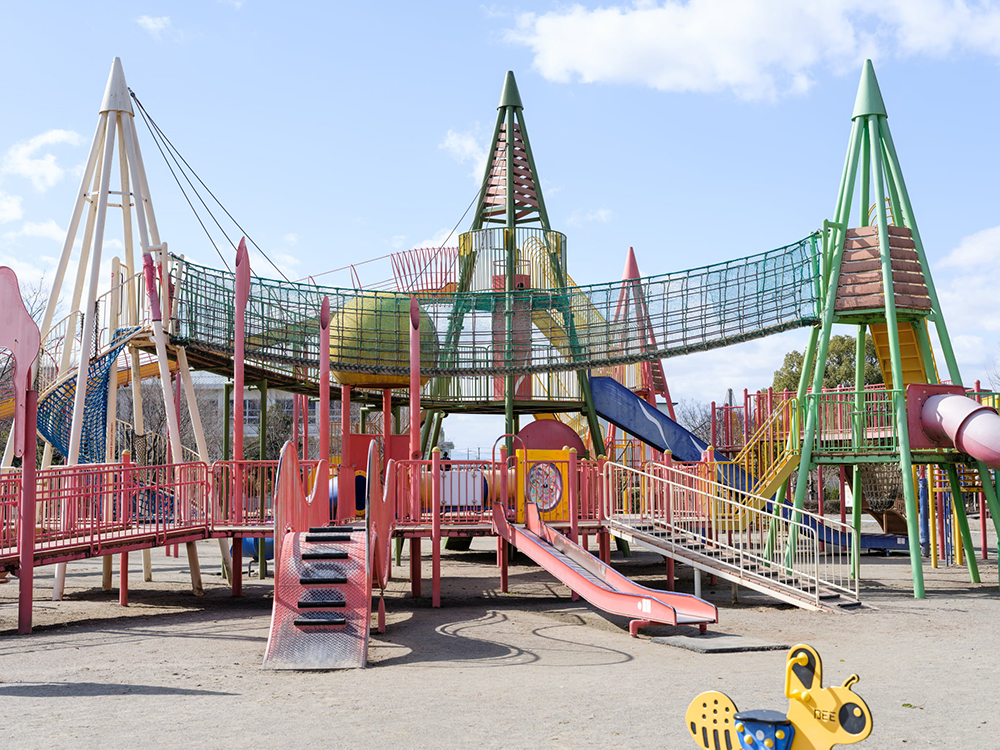 幼児から小学生まで楽しめるカラフルな大型遊具があり、迷路のように駆け巡ることができます。ローラーすべり台やグラグラ吊り橋、スリル満点のアスレチック遊具もあります。