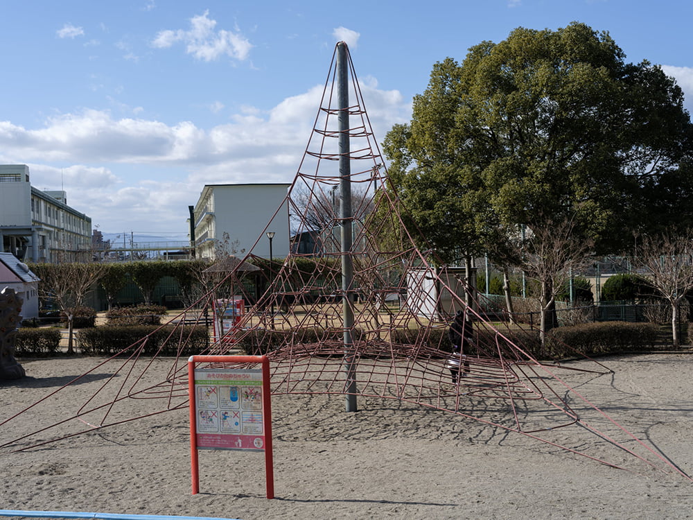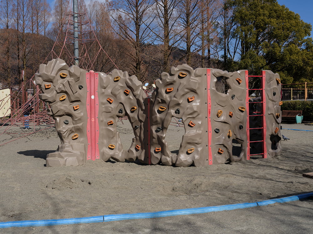 クライミングごっこができる壁型遊具や、ネットが高く複雑に組み合わせられたネットツリー、大小違うサイズのうんていや飛び石型遊具など、すみからすみまで思い切り体を動かせる工夫が詰まった遊具です。