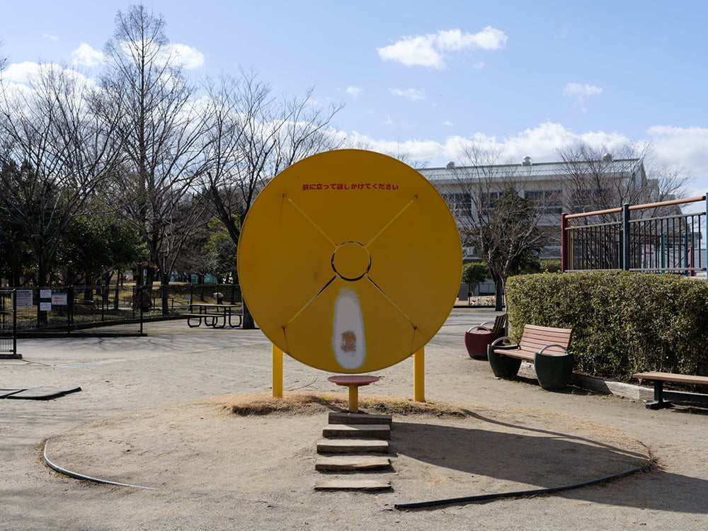 大きなお皿が少し離れて向かい合って立っているような不思議な遊具があります。親子それぞれお皿に向いて立つと、離れているのに小さな声でも会話ができます。音の反響を使った遊具で、知的好奇心をくすぐられちゃいますね~。