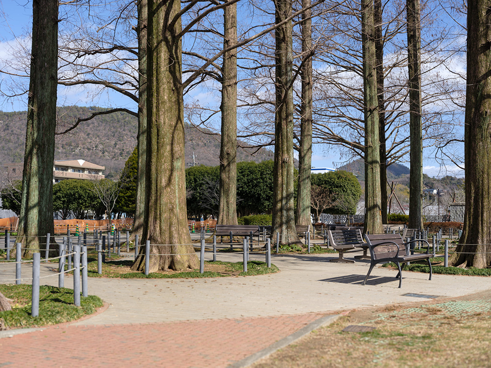 駐車場から入ってすぐに、メタセコイアの林があります。その中にはベンチがいくつか設置されているので、木陰でのんびりリラックスするのもいいですね。