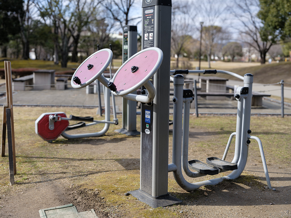 公園の南側にひっそりと展開されている健康器具コーナーは、大人だけしか入れません。なぜかというと、公共の公園なのに結構器具が本格的だから!エアロバイクや筋トレマシン、ストレッチマシンが並んでいます。