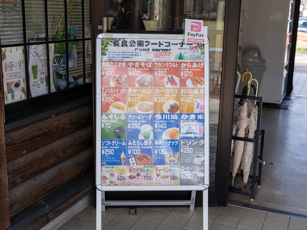 非常にありがたいことに、長良公園には売店があります。焼きそばやフランクフルト、みたらし団子やたこ焼き、ソフトクリームなどのメニューがあり、すべてのメニューがテイクアウト可能です。