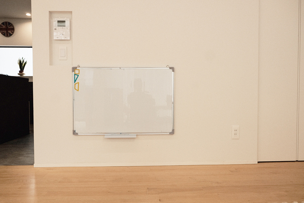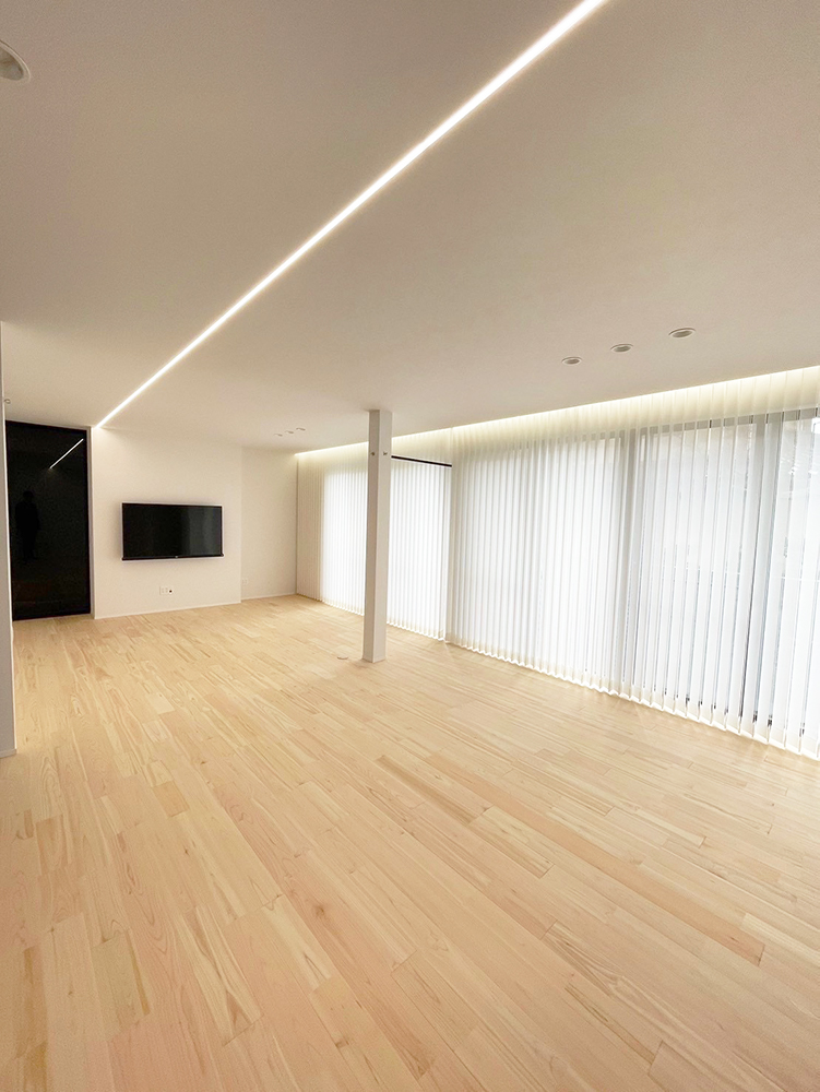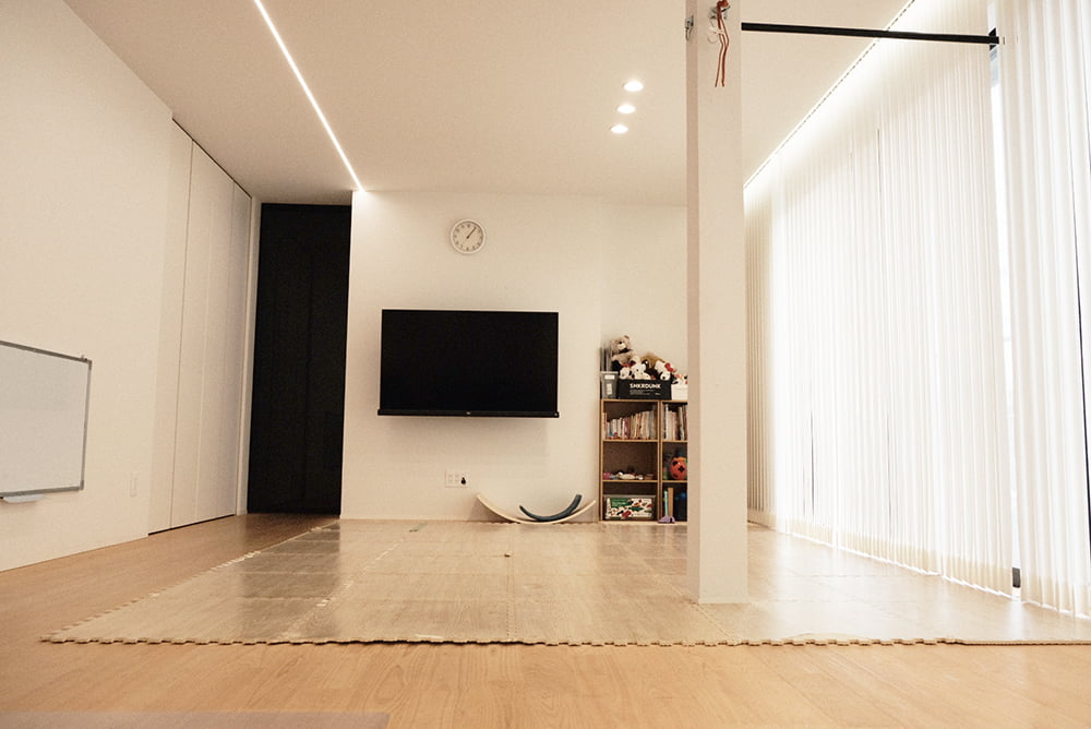 6畳と10畳の洋室の壁&ドアをぶち抜いた、どかーんと広い16畳のスペースです。ライン照明を使うことでスタイリッシュさを出しつつ無垢床で温かみのある空間になっています。ママや子どもが気軽に集まれ、イベントやワークショップを通じて、親子のふれあいや成長の場に!