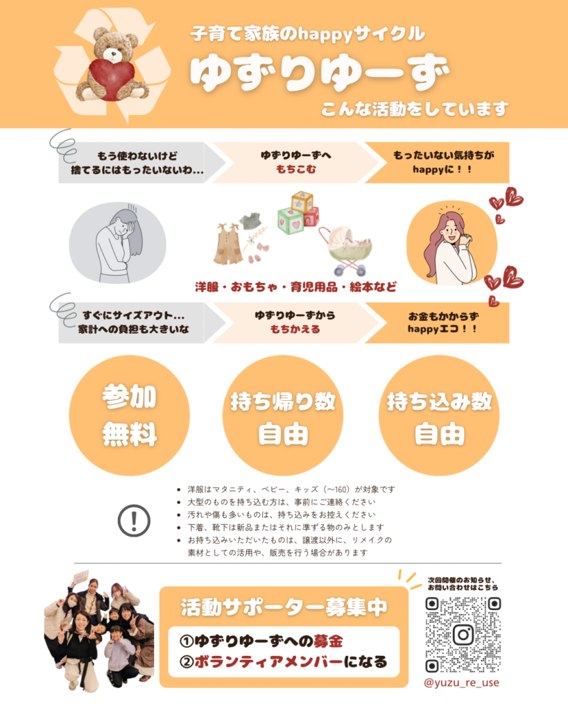『ゆずりゆーず』は、岐阜市で月に1回ペースで開催されている、マタニティ・ベビー・キッズ用品の「おゆずり会」です。